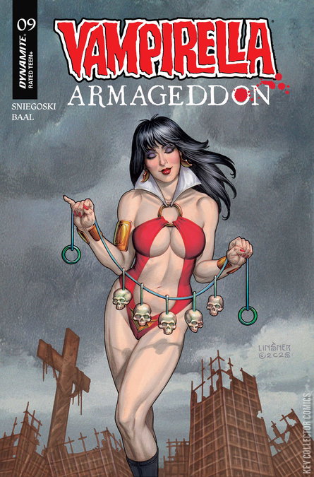 DARK VAMPI RISING! In this issue: All Hell breaks loose — literally! Rising up from the deepest circles of the Inferno, Dark Vampirella has been loosed upon the world, and she’s bringing fiery vengeance with her! Can the heroic Daughter of Drakulon stand up to her bigger, badder self and survive to drink blood another day? Find out in the brimstone-scented pages of Vampirella: Armageddon #9, from the diabolically creative team of TOM SNIEGOSKI and EDU MENNA — featuring sinfully sensuous covers from FRANCESCO MATTINA, LESLEY “LEIRIX” LI, JOSEPH MICHAEL LINSNER, and cosplay by LAUREN DELOREAN!