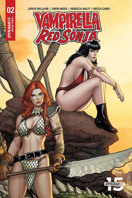LET THE TEAM-UP BEGIN! In this issue: Vampirella takes a potion. Red Sonja gets hung upside-down by magic. A magical mystical mysterious gem begins to reveal its secrets. And many, many, SO many hamburgers are consumed. The ongoing sensation continues courtesy of JORDIE BELLAIRE (Buffy The Vampire Slayer) and DREW MOSS (Star Wars)!