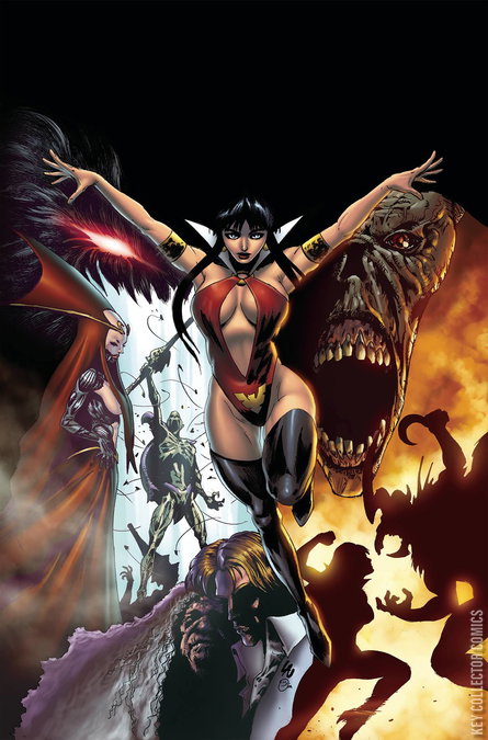 Final issue! It's been 15 years since the death of Mistress Nyx and the world is slowly recovering, but this isn't a world that we've ever seen before. This is a world where the natural and the supernatural have merged to create a dangerous new place - a world very much in need of Vampirella. Deep beneath the streets of Sepulcher City an ancient goddess stirs. Vampirella and the werewolf, Dagwood, are on a mission to save an innocent child and confront a demonic deity with a forbidden knowledge of the future - a future where Vampirella herself is responsible for the end of the world! Enter the world of Vampirella Strikes under a series of amazing artist by returning superstars Lucio Parillo, Stephen Segovia, Jonathan Lau, Junggeun Yoon, and another stunning cosplay cover featuring Dizzy Ms. Lizzyy as Vampirella!