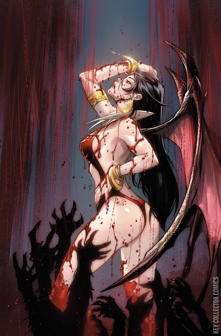 Final issue! It's been 15 years since the death of Mistress Nyx and the world is slowly recovering, but this isn't a world that we've ever seen before. This is a world where the natural and the supernatural have merged to create a dangerous new place - a world very much in need of Vampirella. Deep beneath the streets of Sepulcher City an ancient goddess stirs. Vampirella and the werewolf, Dagwood, are on a mission to save an innocent child and confront a demonic deity with a forbidden knowledge of the future - a future where Vampirella herself is responsible for the end of the world! Enter the world of Vampirella Strikes under a series of amazing artist by returning superstars Lucio Parillo, Stephen Segovia, Jonathan Lau, Junggeun Yoon, and another stunning cosplay cover featuring Dizzy Ms. Lizzyy as Vampirella!