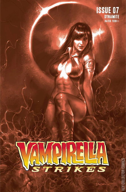 It has been fifteen years since the death of Mistress Nyx and the world in slowly recovering, but this isn't a world that we've ever seen before. This is a world where the natural and the supernatural have merged to create a dangerous new place-a world very much in need of Vampirella. Wearing the guise of a Chaos Cult leader, Vampirella has infiltrated a special meeting of the highest order. What plans does the insidious demon cult have for the unsuspecting world and what do they have to do with the return of one of Vampirella's most dangerous enemies, the blood red Queen of Hearts? Enter the world of Vampirella Strikes under a series of amazing artist by returning superstar artists Lucio Parrillo, Stephen Segovia, Junggeun Yoon, plus another stunning cosplay cover featuring Rachel Hollon!