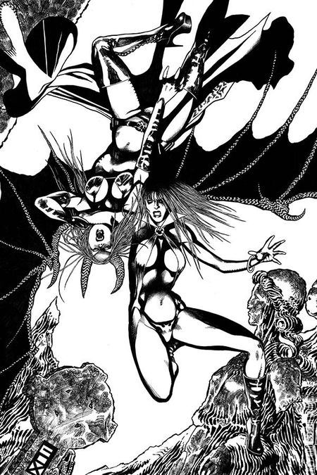 So yeah.  Vampirella and Purgatori. Vampi, the Vampiri with a conscience and Tori, the lady-shaped creature who eats conscience. Working together? Not really. Working towards a common goal, while considering tearing each other's throats out, more like!  And that common goal is to stop Lilith and her near-infinite minions from having their rough, rude way with the entire human race. The stakes are big enough... and sharp enough. Everybody's in... it's time to ante up.