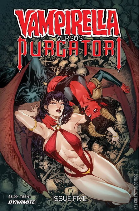 All the players are out in the open now, and the field's starting to get bloody. Sacrifices are being made and heads are rolling... and now, of course, Vampirella's finally got to face it: Purgatori's not on her side. She's not on the enemy's side either. She's on a side all her own, and the stakes are even bigger than before. Bigger than the whole world? Yeah. That's right. And now this whole damn fight's going to have to get UGLY. We're going to level with you: the bad guys have this one sewn up. Lilith's won. Or... Purgatori's won. The human world is finished. May as well pack your bags and head back to Drakulon or wherever you're from. Unless... Vampirella's got a surprise up her sleeve? A deadly surprise involving spectacularly gruesome mayhem? LET'S FIND OUT!