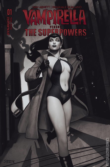 It's full-throttle throwback action, courtesy of superstar writer Dan Abnett (Avengers, Warhammer) and red-hot artist Pasquale Qualano (DC Vs. Vampires)! Vampirella and her trusty sidekick Dyna Might have become superheroes, and are assigned to save a world that looks strangely similar to 1940s Earth, rife with crime and corruption, and two-fisted superheroes who don't take kindly to meddling from interdimensional vampire aliens! Can Vampirella survive an onslaught of conflict from villains and heroes alike, all while solving a murder mystery and keeping her precocious sidekick alive?
