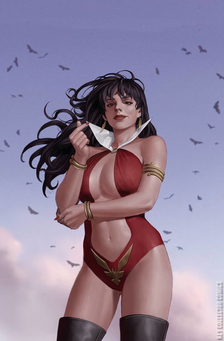 It's full-throttle throwback action, courtesy of superstar writer Dan Abnett (Avengers, Warhammer) and red-hot artist Pasquale Qualano (DC Vs. Vampires)! Vampirella and her trusty sidekick Dyna Might have become superheroes, and are assigned to save a world that looks strangely similar to 1940s Earth, rife with crime and corruption, and two-fisted superheroes who don't take kindly to meddling from interdimensional vampire aliens! Can Vampirella survive an onslaught of conflict from villains and heroes alike, all while solving a murder mystery and keeping her precocious sidekick alive?