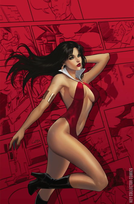 It's full-throttle throwback action, courtesy of superstar writer Dan Abnett (Avengers, Warhammer) and red-hot artist Pasquale Qualano (DC Vs. Vampires)! Vampirella and her trusty sidekick Dyna Might have become superheroes, and are assigned to save a world that looks strangely similar to 1940s Earth, rife with crime and corruption, and two-fisted superheroes who don't take kindly to meddling from interdimensional vampire aliens! Can Vampirella survive an onslaught of conflict from villains and heroes alike, all while solving a murder mystery and keeping her precocious sidekick alive?