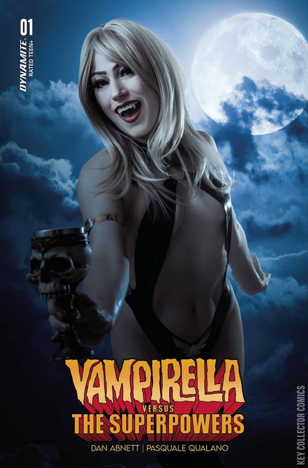 It's full-throttle throwback action, courtesy of superstar writer Dan Abnett (Avengers, Warhammer) and red-hot artist Pasquale Qualano (DC Vs. Vampires)! Vampirella and her trusty sidekick Dyna Might have become superheroes, and are assigned to save a world that looks strangely similar to 1940s Earth, rife with crime and corruption, and two-fisted superheroes who don't take kindly to meddling from interdimensional vampire aliens! Can Vampirella survive an onslaught of conflict from villains and heroes alike, all while solving a murder mystery and keeping her precocious sidekick alive?
