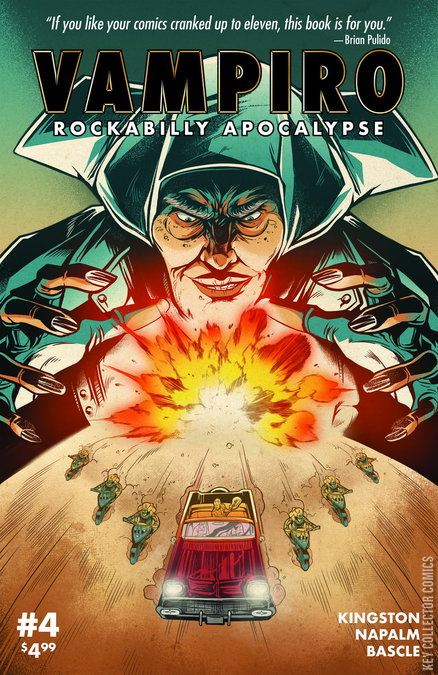 Cover by series artist El Terrorifico Dr. Napalm, who specializes in retro style poster art inspired by pop culture and cult classic icons. Every guitarist knows his name. His performances are the stuff of legend. He's played all over the world, but his face has never graced a single concert poster. He's never advertised. He just�appears! It's an action-packed duel in the desert! The Bonneville is out of commission and our heroes are pinned down by The Bad Habit�and the blazing desert sun! Can Estrella and Everitt hold off the shotgun-wielding Sisters of Mercy? Can Vamp survive an all-out war against Abaddon-- the Black Queen of the Abyss? And what role does The Monster Cop and his film school dropout nephew have to play in all of this?