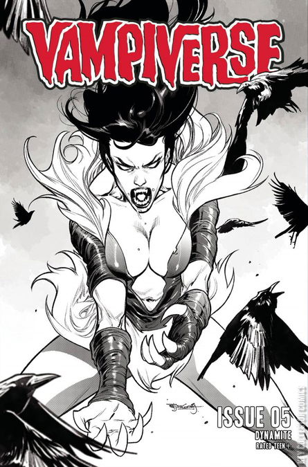 With Book as her captive, Bloodwing continues to murder Vampirellas across the different realities, searching for the missing pages of the Book of Prophecy in her twisted quest to find and destroy the Artist. Meanwhile, Vampirella and her sisters of Draculon do battle during the Stone Age against an ancient tribe of Chaos demons before beginning their journey to save all reality. This penultimate issue of VampiVerse has it all-death, destruction and more Vampirellas than you can shake a stick at! You don't want to miss this one!