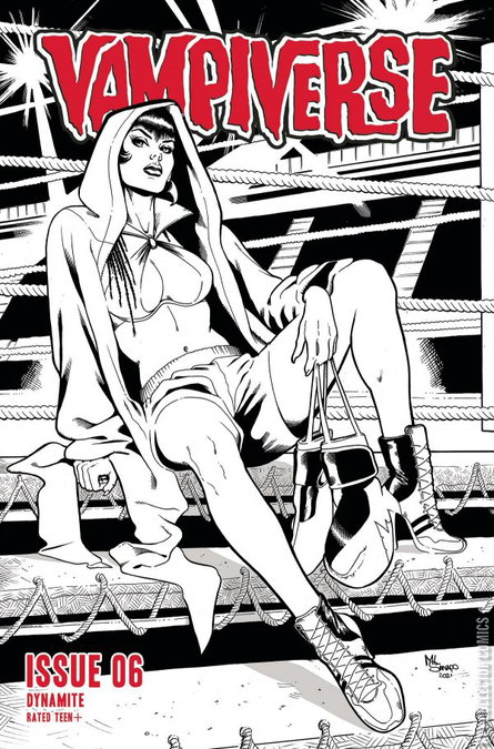 In this issue, the evil Vampirella, Bloodwing, and her captive Book at last reach the fabled Library, the final stop before she can carry out her nefarious plan of destroying the Artist and rewriting all of the Vampirellas' realities. But there are still major roadblocks: Book is missing the crucial pages that will lead them directly to the Artist, and an army of Vampirellas from realities far and wide hellbent on stopping her have just arrived at the Library. Will the daughters of Drakulon be able to defeat their psychotic sister and save the threads of the Fabric, or will Bloodwing vanquish them all and reshape their stories in her own glorious, twisted image?
