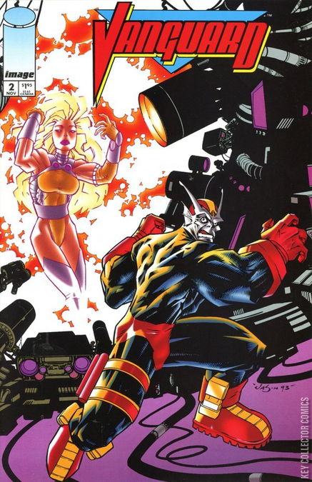 The imprisoned Vanguard attempts to escape from a maximum-security prison, while Roxanne Wells and her camerawoman fix Vanguard's helmet. Wally, Vanguard's sentient computer, using teleportation, exchanges Vanguard's body with that of an identical clone, nicknamed "Lurch." The real Vanguard ends up in a science lab instead of on his ship, however, where he accidentally damages important advanced machinery. A resulting accident grants one of the scientists super-powers, who then goes insane with power and renamed herself Modem. Wally, in teleporting Vanguard's helmet to the ship, brings Roxanne Wells with it.In a back-up story, a convicted criminal in an experimental space-exploration pod is attacked and then "possessed" by aliens, and then decides to return to Earth.