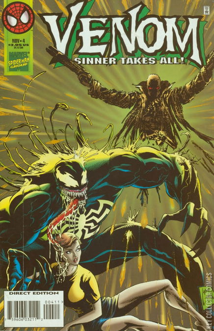 The new Sin-Eater makes Hannibal Lecter look like a little lamb--but now it's Venom's turn to feast! And what effect will Eddie's symbiote miracle-cure have on his ex-wife? Written by Larry Hama. Art by Greg Luzniak, Keith Aiken and Jeff Albrecht. Plus: bonus back-up story featuring the Jury. Cover by Steve Lightle. 48 pages. Cover price $2.95.