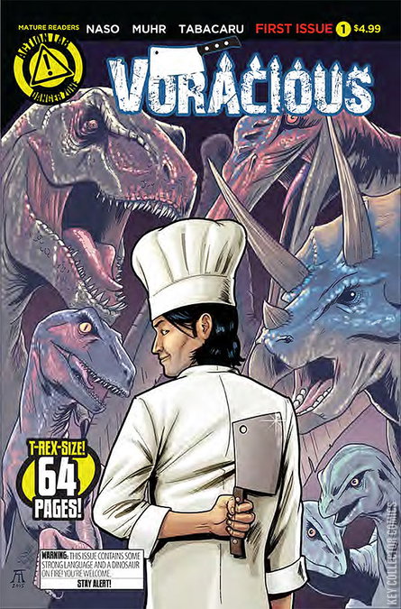 JURASSIC PARK MEETS TOP CHEF! Haunted by the death of his sister, Chef Nate Willner has lost his desire to cook. Forced to move back to his hometown in Utah and work at a coffee shop, Nate's life is quickly becoming a dead end. But when he unexpectedly inherits a time travel suit that takes him to the age of dinosaurs, Nate's passion for cooking is reignited! Extra-Sized Debut Issue! 40 Delicious Pages! Featuring a wraparound variant cover by Thrillbent at SDCC 2015 Contest Winner and VORACIOUS series artist Jason Muhr! Limited to 1500 copies.