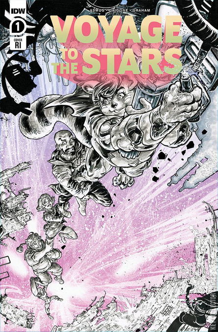 The hit sci-fi comedy podcast starring Colton Dunn (Superstore), Felicia Day (Supernatural), Janet Varney (Legend of Korra), Kirsten Vangsness (Criminal Minds), and Steve Berg (Drunk History) crashes into comics! Earth is gone. Only one intrepid crew of misfits managed to escape, now determined and ambiguously destined to stop a growing, ancient evil from consuming the universe. Though stopping it may be tricky, as our heroes can't help but destroy just about every planet and species they come across. Kinda debatable who's the bigger threat. Voyage to the Stars is a bonafide podcast phenomenon! With 2.5 million downloads in its debut year and over 100,000 viewers on Twitch, the wild sci-fi podcast that's consistently ranked in the Top 100 for comedy is now on its way to conquer the comics world, helmed by five-time Harvey Award-nominee James Asmus!