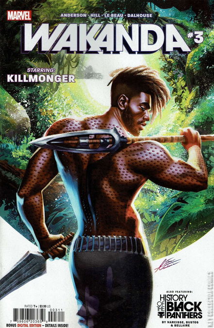 The spotlight on great characters who have defined Wakanda continues, taking us back in time into the heart of KILLMONGER! A haunting story that explores his earliest days under the thumb of Ulysses Klaw, and the early foundations of the man who will one day bear a scar for each of his kills… Plus, the third chapter of Evan Narcisse and Natacha Bustos ’ History of the Black Panthers, focusing on the mysterious Nehanda as she bands together with the Medieval Avengers!