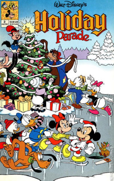 Reprints of Holiday Stories from various sources listed below. “The Christmas Cha Cha” with Donald Duck, Huey, Dewey, Louie, Uncle Scrooge, Daisy Duck and The Billionaires' Club. Originally from (Walt Disney's Christmas Parade #26 (Dell, 1959 series) December 1959). Writer Carl Barks, Artist Carl Barks and Colorist Sue Daigle-Leach, Letterer Gare Barks. Li’l Bad Wolf, Big Bad Wolf and the Three Little Pigs in “Pop’s Accidental Good Deed”. Originally in (Walt Disney's Christmas Parade #8 (Dell, 1949 series) December 1956). Writer Carl Fallberg, Artist Frank McSavage, Colorist Janice Parker. “Mousekeeping Housekeeping” with Grandma Duck, Gus and Juc (the mice from Cinderella). Originally published in (Walt Disney's Christmas Parade #3 (Dell, 1949 series) November 1951). Writer Don R. Christensen, Artist Riley Thompson, Colorist Joan Goldman “Christmas Fray” featuring Chip ”n” Dale plus Donald Duck. Originally in (Walt Disney's Christmas Parade #2 (Dell, 1949 series) November 1950). Artist Paul Murry, Colorist Valerie Del Chele, Letterer Bill Spicer. Goofy as Super Goof in “Santa’s Helper”. Originally in (Walt Disney's Christmas Parade #26 (Dell, 1959 series) December 1959). Writer Werner Wejp-Olsen, Artist Tello, Colorist GAFF, Letterer Bill Spicer. Brer Rabbit, Brer Owl, Brer Fox and Brer Bear in “Bear Claus” Originally in (Walt Disney's Christmas Parade #26 (Dell, 1959 series) December 1959). Artist Al Hubbard, Colorist Jo Meugniot. “A Day with Santa” featuring Mickey Mouse, Mortie Fieldmouse, Ferdie Fieldmouse and Santa Claus. Originally in (Donald and Mickey Merry Christmas 1948 (Dell, 1943 series) 1948). Artist Harvey Eisenberg, Colorist GAFF Cover Artist Rick Hoover, Cover Colorist Gail Bailey. Full color 64 pages on standard paper with $2.95 cover price.