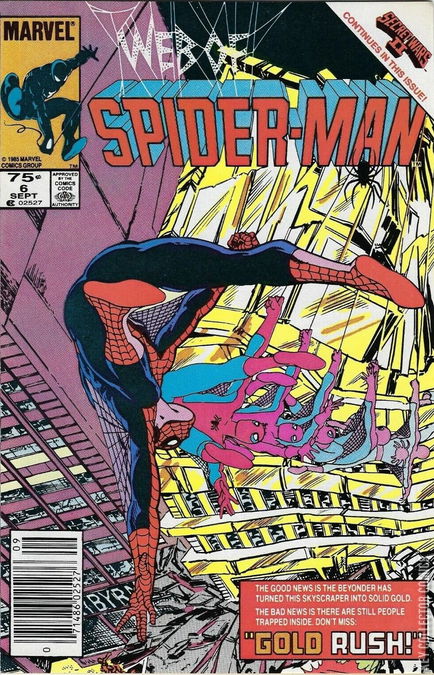 GOLD RUSH! The Kingpin is woken up at 3:00 am with some troubling news. He places a call to a man Bainbridge. As he waits for the man to answer, he figures out the financial worth of the current crisis and realizes that it could make the great depression seem like prosperous times. When Bainbridge answers the phone, the Kingpin explains what must be done... While elsewhere in Manhattan, Mary Jane Watson cannot sleep, her mind keeps coming back to the fact that she had recently revealed to Peter Parker that she's known that he's secretly Spider-Man for years[Continuity 1]. She struggles with the fact that she can't be with someone that risks their lives on a daily basis, and although she is still friends with Peter she cannot shake the feelings she has for him. As she considers the strange twist of fate she finds herself in, she notices that there is a fire some blocks away and wonders what the cause of it could be. At the site of the fire is the man of Mary Jane's thoughts, Spider-Man who is at the scene of the office building that formerly housed the Heroes for Hire until the Beyonder recently turned the structure entirely into gold just moments ago. Realizing that there might be people trapped inside the building despite the late hour, Spider-Man enters the building and begins finding those who are trapped inside and finds that everything except for humans has been turned into gold.[Continuity 2] As Spidey searches for survivors, those few who are still up at this late hour find it almost impossible to believe that a building can be turned into gold. However, before anyone can capitalize on this, the Kingpin calls in to his contacts in Washington D.C. to assist in closing off the area to prevent people from making off or learning about this sudden cache of gold, as it could cause a financial crisis. Hard pressed for resources, the government makes a deal with the Kingpin even though they realize that they are making a deal with the proverbial devil. Unaware of this deal, Spider-Man continues to rescue those trapped in the building as two police officers arrive. When the cops wonder how they will keep the public away from a giant pile of gold, they soon find themselves surrounded by a heavily armed guard of gangsters and street thugs. They are soon relieved by government agent Charles Anderson who explains to the two officers that these men as assisting in keeping the area secure until the military arrives. When Spider-Man returns to the outside he recognizes some of the armed men as enforcers for the Kingpin. He also witnesses as the owner of the building, Henry Trumpsley, is forced to accept a check buying his property and is escorted off the property. When Anderson tells Spider-Man to leave, the Wall-Crawler refuses to tell him that he can rescue the people trapped inside easier. Despite being shot at, Spider-Man slips back inside, wondering what the Kingpin has to do with the recovery. Seeing that he is unable to stop Spider-Man, and hard pressed for resources, Anderson orders the men to hold their fire and let Spider-Man do his job. As the work continues on, over in Queens Aunt May and her fiancée Nathan Lubensky mull over the financial problems they're having keeping their elderly boarding house afloat. By this time, the military has arrived and begun slowly removing the gold and shipping it out of the area and a massive barrier is being erected around the block to prevent people from seeing it. By the time the press arrives, there is speculation going around as to what the military is clearing out of the area. Inside the wreckage, Spider-Man continues to pull people out of the building. For the most part, everyone is alive, but he does come across one dead body within the wreckage. After bringing the body out, Spidey decides to take a break and take into consideration that scope of what the Beyonder has done. Everything, including simple trash, has been turned into gold, a discarded notebook that was considered trash hours earlier is now worth a small fortune. When Peter considers how much he and his Aunt May could benefit from something as small as a solid gold notebook, Peter wrestles with his desires and what he feels is the right thing to do and leaves the notebook behind. Spider-Man's attention is drawn to another individual who is trapped in the building. However, upon closer inspection, the Wall-Crawler learns that the reason why the man is trapped is that he was attempting to carry out all his personal possessions that had been turned into gold and that the weight of it all had pinned him to the floor. The man is unwilling to give it all up until the roof begins to collapse over their head and he begs Spider-Man to save him. With the last of the people out of the building, Spider-Man is about to web-sling away when he notices a black limo pull up to Anderson. Spider-Man is shocked to see that it is his old foe the Kingpin, and becomes angry when he witnesses a number of soldiers loading several gold typewriters into his limo. Furious that he must struggle through life while a known criminal like the Kingpin gets free gold from the government, Spider-Man finally has enough and decides to get what he believes he deserves. Jumping back into the ruins of the building, he recovers the gold notepad that he previously decided to leave behind. Exiting the building he confronts Anderson and tells him that he saw the transaction between him and the Kingpin and shows him that he intends to keep a reward for himself. After angrily chastising the government official, Spider-Man swings off leaving Anderson to consider what he has just done.