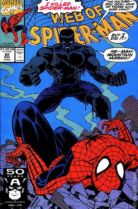 PUMPING UP! Spider-Man pulls himself out of some rubble next to a bar, wondering what hit him. He is approached by Daily Bugle reporter Ben Urich who tells him what happened. Moments earlier, Man-Mountain Marko entered the bar to collect protection money for the Maggia. When he saw Spider-Man swinging by earlier, he went into a rage, throwing the bar taps into the wall causing it to collapse on the wall-crawler. Marko then rampaged out of the area, leaving Spider-Man for dead. The wall-crawler can hardly believe that Marko was capable of such strength. Before he leaves, Urich tells the hero that the police are out looking for Marko as he had kidnapped a child. Elsewhere, Man-Mountain Marko lifts weights in front of Johnny, the boy that he allegedly kidnapped. As it turns out, Johnny has come with Marko willingly in the hopes that he can be trained by Marko himself. When the boy asks when the training will begin, Marko assures the boy that it will happen soon. Meanwhile, Spider-Man has learned the location where Man-Mountain Marko works out from Ben Urich and has decided to check it out. When he asks the other weightlifters where he can find Marko only to be attacked. Despite their great strength, Spider-Man easily defeats them all thanks to his superior agility and speed. Unable to stop the wall-crawler the weightlifters decide to flee. The hero then finds Marko's locker and forces his way inside. Inside he finds the locker plastered with articles about Spider-Man as well as bottles of racehorse steroids. The wall-crawler then forces his way into the trainer's office to find out why he has been providing them to Marko. The trainer explains that Marko can do the steroids since he has been barred from any professional competitions since the Maggia boosted his strength. As it turns out, Marko has been asking for a lot of drugs, which the trainer has been more than happy to provide. When Spider-Man asks if the man cares about what these drugs can do with someone with enhanced genetics, the trainer admits that he doesn't really care one way or the other. Back at Marko's home, Johnny has brought the Man-Mountain dinner, he tells the boy not to bug him since he is watching the news. When he hears reports about how Spider-Man survived his attack, Marko insists that he will defeat the wall-crawler once and for all and returns to his workout regiment. At that moment, Peter Parker is out having dinner with his wife Mary Jane. Mary Jane has noticed that Peter is getting sick and suggests he takes some cold medication. However, Peter is concerned that it may affect his spider-sense and he needs it when he saves Man-Mountain Marko's hostage. Meanwhile, Man-Mountain continues pumping iron, telling Johnny that when he was the boy's age everyone feared and respected him because he was so strong. That evening, Spider-Man has managed to track down the Maggia headquarters. Because the organization has seen better days, thanks to the Kingpin's control of the underworld, Spider-Man easily slips inside. In the building, he confronts Snakey Duvall and demands that he reveal Marko's address. Spider-Man snatches Snakey's address book and escapes before his bodyguards can stop him. Later that evening, Man-Mountain Marko has a fitful sleep. He has a nightmare which begins with Spider-Man taunting him about how weak he is, reminding Marko of the first "dweeb" that pushed him around. Marko then relives that moment, years ago when he was nothing but a petty street hood. He remembers one day when a young man in glasses was hurrying past him. Marko made the mistake of pushing the young teenager around, unaware that he was messing with Spider-Man's alter-ego, Peter Parker. Distracted with thoughts of the health of his Aunt May, Peter unconsciously knocked Marko aside with a single slap. Realizing what he had done, young Peter asked Marko if he was all right, but a frightened Marko began begging the youth to keep away. Shouting in his sleep, Marko wakes up Johnny who goes into his room to see if he is all right. After the nightmare, Marko doubts his strength and ability, but Johnny convinces him that he is the strongest there is, secretly wishing Spider-Man would show up to prove him right. Incidentally, Spider-Man is on his way and comes up with a plan on how to handle the situation. Going to a payphone, the wall-crawler calls Ben Urich to call the police in ten minutes, giving him just enough time to save Johnny. In return, the web-slinger agrees to give Urich the story any way he wants it. When Spider-Man sneaks into Johnny's room and wakes the boy, he calls out to Man-Mountain Marko. Hearing the boy's cries for help, Marko comes crashing through the wall. The two end up fighting it out on the front lawn. Soon the police arrive on the scene with Ben Urich as the fight continues on. Although Marko has superior strength, Spider-Man has speed and agility on his side. They continue fighting until dawn where the battle abruptly ends when an exhausted Marko collapses to the ground. With Spider-Man the victor, Johnny begins cheering on the hero instead. With the situation under control, Spider-Man takes off, leaving Urich to get the story and Man-Mountain to be taken away by the police.