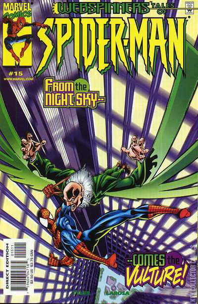 Winging in from the events of AMAZING SPIDER-MAN #12 and PETER PARKER: SPIDER-MAN #12, the Vulture swoops in for a vertigo-inducing thriller! Adrian Toomes blacks out part of New York City to pull off his most audacious plan ever! And when Spider-Man gets on his tail, you'll see airborne acrobatics the likes of which have never before been experienced! It's a fight to the finish set in the Vulture's domain, and it's the Vulture at his most vicious! The Vulture's first stop on his little shopping spree is the penthouse apartment of a wealthy British couple. Spooked by the blackout and trying to protect his terrified wife, her husband manages to fire one bullet through his living room window before coming face to face with Adrian Toomes and collapsing with severe chest pain. His wife agrees to give the Vulture what he came for - "the 'Heavens of Aphrodite', eighty diamonds set in ropes of gold" - to appease him, and he flies off into the night in search of his next bauble. While this is happening, Spider-Man is on the other side of town taking care of your typical carjacking, thumping two of the bad guys and trapping the other two in the stolen car with a considerable amount of web fluid. He just finishes by the time the police arrive. Instead of pulling the standard "Spider-Man is just as bad as the crooks, we must arrest him!" line, the cops actually treat him like a human being and even offer him some donuts. Before he can break bread with New York's finest, however, a report of the blackout comes over the police scanner and Spidey swings off to investigate. By this time, the Vulture has arrived at the penthouse of Jill DeMarley and his plans have hit a snag. It seems Jill has divorced her loser husband and he has the "Sapphire Garden" necklace that Mr. Toomes wants for himself. Realizing his dilemma, the Vulture takes Ms. DeMarley's daughter Tamara hostage. He threatens to leave her on a building treated with a chemical compound that reacts to electric...