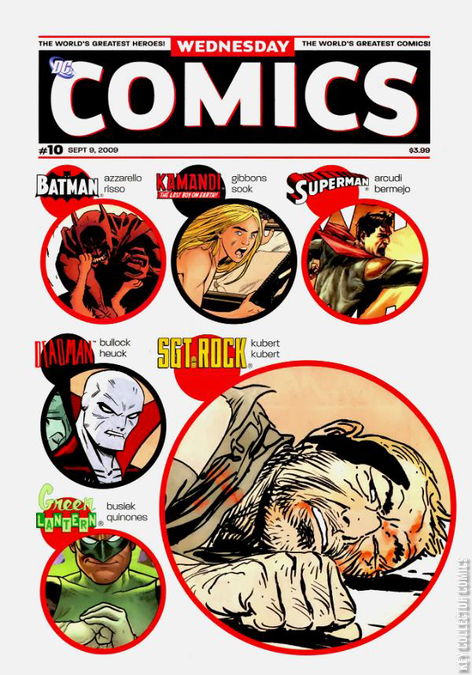 WEDNESDAY COMICS, DC's new, 12-issue weekly series, reaches its incredible conclusion in September. Here are just some of the highlights of this third and final month: - In BATMAN, WEDNESDAY COMICS' weekly cover feature, Bruce Wayne digs further into a steamy murder mystery. It's a classic noir tale by the Eisner Award-winning 100 BULLETS team of writer Brian Azzarello and artist Eduardo Risso. - METAMORPHO dives into a fever-dream of an adventure, written by New York Times best-selling writer Neil Gaiman with art by Eisner Award-winner Michael Allred (Madman). - THE DEMON AND CATWOMAN make a deadly detour after Selina Kyle attempts to rob Jason Blood's collection of antiquities, taking her into unexpected territory. Written by Walter Simonson (Thor, MANHUNTER) with art by famed DC cover artist Brian Stelfreeze. - DEADMAN is warned off of pursuing a serial killer by the only being who could do so: Rama Kushna. It's a tale of mystery and mystics written by Dave Bullock and Vinton Heuck, art by Dave Bullock. - KAMANDI explores the living nightmare that is the world after the Great Disaster in a sprawling tale written by Dave Gibbons (WATCHMEN, GREEN LANTERN CORPS) with art by Ryan Sook (Buffy The Vampire Slayer, ARKHAM ASYLUM: LIVING HELL). - The feathers fly as HAWKMAN heads into slam-bang action, as written and illustrated by Kyle Baker (PLASTIC MAN, Special Forces). - SGT. ROCK is captured by German forces - but will the Rock break? Find out in a gritty wartime epic written by Adam Kubert (SUPERMAN: LAST SON) and ilustrated by legendary comics artist Joe Kubert. And don't miss these continuing features: - THE METAL MEN, written by Dan DiDio with art by Jose Luis Garcia-Lopez. - THE FLASH, written by Karl Kerschl (TEEN TITANS YEAR ONE, THE FLASH: THE FASTEST MAN ALIVE) and Brenden Fletcher with art by Karl Kerschl. - SUPERGIRL, written by Jimmy Palmiotti (JONAH HEX) with art by Amanda Conner (POWER GIRL). - GREEN LANTERN, written by Kurt Busiek (TRINITY, ASTRO CITY) with art by Joe Quinones (TEEN TITANS GO!). - SUPERMAN, written by John Arcudi (The Mask) with art by Lee Bermejo (JOKER). - ADAM STRANGE, written and illustrated by Paul Pope (BATMAN: YEAR 100). - WONDER WOMAN, written and illustrated by Ben Caldwell (Dare Detectives). - THE TEEN TITANS, written by Eddie Berganza with art by Sean Galloway. WEDNESDAY COMICS will arrive in stores folded twice to 7" x 10".