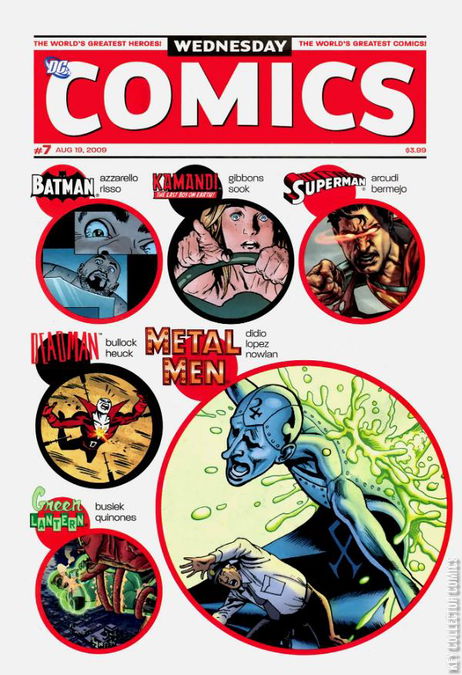 WEDNESDAY COMICS, DC's spectacular 12-issue weekly series, continues to offer a comics experience unlike any other this August. In its second month, don't miss the action in these continuing features: WEDNESDAY COMICS, DC's spectacular 12-issue weekly series, continues to offer a comics experience unlike any other this August. In its second month, don't miss the action in these continuing features: • THE METAL MEN encounter a deadly guest-villain in a story written by Dan DiDio with art by Jose Luis Garcia-Lopez. • THE FLASH battles Gorilla Grodd and tries to date Iris West in a story written by Karl Kerschl (TEEN TITANS YEAR ONE, THE FLASH: THE FASTEST MAN ALIVE) and Brenden Fletcher with art by Karl Kerschl. • SUPERGIRL attempts to deal with Streaky and Krypto gone bad in a story written by Jimmy Palmiotti (JONAH HEX) with art by Amanda Conner (POWER GIRL). • GREEN LANTERN must help a fellow test pilot whose space mission has transformed him into a monster in a story written by Kurt Busiek (TRINITY, ASTRO CITY) with art by Joe Quiñones (TEEN TITANS GO!). • SUPERMAN questions his heroic mission while on a trip to Smallville in a story written by John Arcudi (The Mask) with art by Lee Bermejo (JOKER). • ADAM STRANGE takes a truly twisted journey into space in a story by writer/artist Paul Pope (BATMAN: YEAR 100). • WONDER WOMAN is lost in a dream world in search of her lost tiara, bracelets and magic lasso in a story written and illustrated by Ben Caldwell (Dare Detectives). • THE TEEN TITANS are attacked by Trident in a story written by Eddie Berganza with art by Sean Galloway. Plus: • BATMAN, WEDNESDAY COMICS' weekly cover feature, by the Eisner Award-winning 100 BULLETS team of writer Brian Azzarello and artist Eduardo Risso. • METAMORPHO, written by New York Times best-selling writer Neil Gaiman with art by Eisner Award-winner Michael Allred (Madman). • THE DEMON AND CATWOMAN, written by Walter Simonson (Thor, MANHUNTER) with art by famed DC cover artist Brian Stelfreeze. • DEADMAN, written by Dave Bullock and Vinton Heuck, art by Dave Bullock. • KAMANDI, written by Dave Gibbons (WATCHMEN, GREEN LANTERN CORPS) with art by Ryan Sook (Buffy The Vampire Slayer, ARKHAM ASYLUM: LIVING HELL). • HAWKMAN, written and illustrated by Kyle Baker (PLASTIC MAN, Special Forces). • SGT. ROCK, written by Adam Kubert (SUPERMAN: LAST SON), ilustrated by legendary comics artist Joe Kubert. WEDNESDAY COMICS will arrive in stores folded twice to 7" x 10".