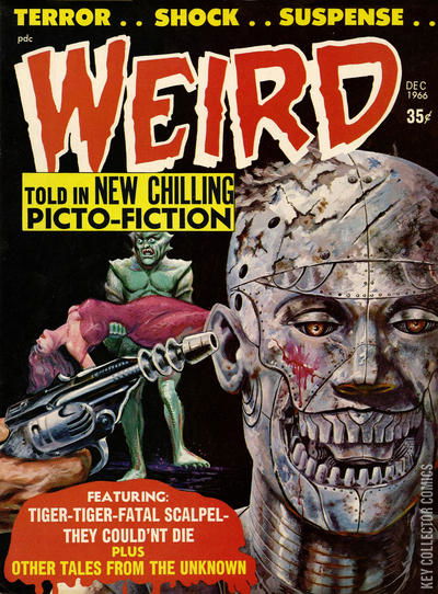 Home / Eerie Publications / Weird / Weird #1 Eerie Publications Released December 1966 Weird #1 Add to Collection Want It Synopsis No synopsis available. Issue 1 of 8 Add to Collection Buy it on eBay Buy on eBay Low $30 Mid $90 High $300 Synopsis No synopsis available. Details Series Weird Cover Date December 1966 Pages 52 UPC N/A Cover Price $0.35 Final Order Cutoff N/A Creators No creators listed. Price Guide Log in or subscribe to access detailed graded price information and market insights. Log In Subscribe