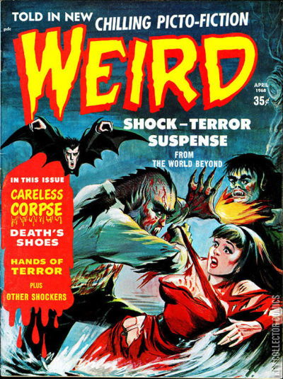Home / Eerie Publications / Weird / Weird #6 Eerie Publications Released April 1968 Weird #6 Add to Collection Want It Synopsis No synopsis available. Issue 6 of 8 Add to Collection Buy it on eBay Buy on eBay Low $5 Mid $15 High $50 Synopsis No synopsis available. Details Series Weird Cover Date April 1968 Pages 52 UPC N/A Cover Price $0.35 Final Order Cutoff N/A Creators No creators listed. Price Guide Log in or subscribe to access detailed graded price information and market insights. Log In Subscribe