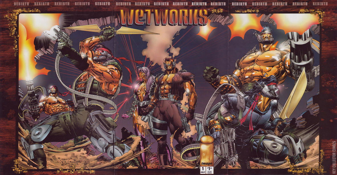 Cover pencils by Whilce Portacio, inks by Scott Williams. Untitled story, script by Whilce Portacio (Plot) and Brandon Choi (Plot, Script), pencils by Whilce Portacio, inks by Scott Williams; I.O. sends Team 7 to Transylvania to recover a dangerous biological weapon; Instead, they find the facility they are supposed to be invading already overrun with vampires and large tubes full of a golden liquid; One of the tubes is ruptured and completely coats Claymore; When the coating proves to be bulletproof and, as they are facing down an army of bloodsuckers, Dane decides to crack the rest of the tubes and turn his whole team golden; The team defeats the vampires but Craven double-crosses them, sending in gunships to wipe them out; Mother One betrays I.O. to save the team and joins. Tri-fold wraparound cover. Whilce Portacio talks about the death of his sister and thanks everyone who made the book possible. These two pages are the inside 2 pages of the front cover of the tri-fold cover. The indicia reads June, but the cover has July.