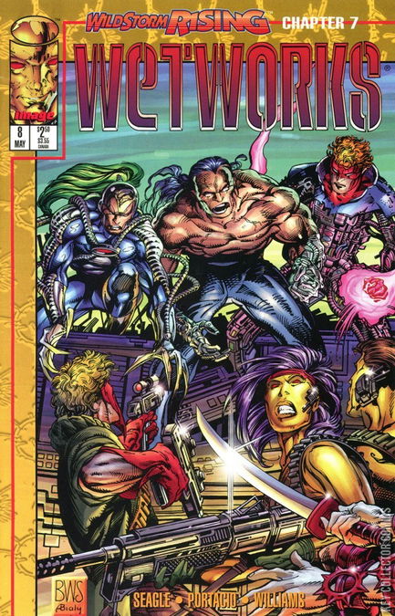 "Wildstorm Rising Chapter 7" Grifter and Deathblow look up their old Team 7 buddy, Dane, looking for the second key to an ancient Daemonite spaceship. Wetworks heads out to find the key but discovers the WildC.A.T.S waiting for them at their destination. While the two teams duke it out, Hightower finds the key grasped in the hand of the deceased Helspont but, before he can pry it from his cold, dead fingers, Helspont returns to life and takes off with the key.
