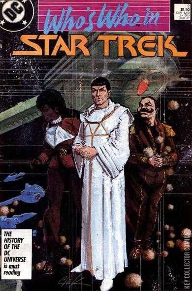The following issue is a who's who of the Star Trek universe. The following is featured in this issue. Marla McGivers, Melkots, Metrons, Miramanee, Mirror Universe, Gary Mitchell, Maria Morelli, M'ress, Harry Mudd, Natira, Number One, Organians, Orions, Christopher Pike, Mark Piper, Janice Rand, Redjac, Kevin Riley, Romulans, Saavik, Sarek, Montgomery Scott, Gary Seven, Areel Shaw, Elizabeth Sherwood, Spock, Starbases, Starfleet, Starfleet Academy, Starships, Hikaru Sulu, U.S.S. Surak, Talosians, Gillian Taylor, Tellarites, Tribbles, Triskelions, Nyota Uhura, United Federation of Planets, Vians, Vina, Vulcans. Appendix: Command symbols from the movies. Wraparound painted covers.