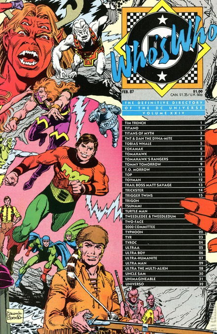 Written primarily by Len Wein and Marv Wolfman (with research by E. Nelson Bridwell and others), Who's Who is a meticulously detailed, alphabetically arranged series of reference volumes that provides personal data, history, and powers and weapons for countless DC characters, both popular and obscure, both new (circa mid 1980s) and old. Volume twenty four has entries for the Top, the Trickster, Two-Face, Uncle Sam, and many others. Character renderings are by such artistic greats as Peter Laird, Brian Bolland, Erik Larsen, Norm Breyfogle, and Murphy Anderson. FULL DETAIL: 24 - Character/artist listing: Tim Trench by Sandy Plunkett and P. Craig Russell; Titano by John Byrne; Titans of Myth by Jose Luis Garcia-Lopez; T.N.T. and Dan the Dyna-Mite by Romeo Tanghal; Tobias Whale by Trevor Von Eeden; Tokamak by Denys Cowan and Greg Brooks; Tomahawk and Dan Hunter by Dan Spiegle; Tomahawk's Rangers by Dan Spiegle; Tommy Tomorrow by Jim Mooney; T.O. Morrow by Joe Brozowski and Greg Brooks; Top by Carmine Infantino and Joe Giella; Toyman by Marshall Rogers; Trail Boss Matt Savage by Carmine Infantino and Bernard Sachs; Trickster by Paris Cullins and Gary Martin; Trigger Twins by Carmine Infantino and Dick Giordano; Trigon by George Perez; Tsunami by Rick Hoberg; Turtle Man by Peter Laird; Tweedledee & Tweedledum by Bill Sienkiewicz; Two-Face by Brian Bolland; 2000 Committee by Joe Brozowski and Art Nichols; Typhoon by Joe Brozowski and Steve Mitchell; Tyr by Denys Cowan and Dick Giordano; Tyroc by Norm Breyfogle; Ultraa by Erik Larsen and Mike Machlan; Ultra Boy by Ron Frenz and Bruce Patterson; Ultra-Humanite by John Statema and Jerry Ordway; Ultra Man by Marshall Rogers; Ultra the Multi-Alien by Terry Beatty and Dennis Jensen; Uncle Sam by Murphy Anderson; Unimaginable by Erik Larsen and Paul Neary; Universo by Greg LaRocque and Arne Starr. Eduardo Barreto cover. Wrap-around cover. 2000 Committee does not appear.
