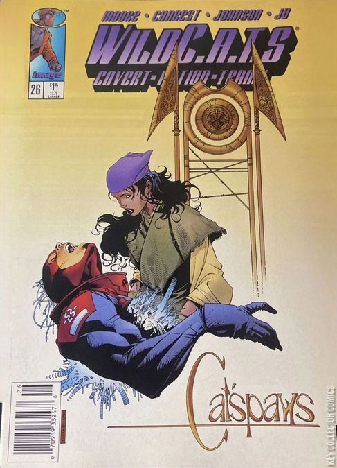 "Cat'spaws" Spartan does some midnight investigating and learns that there is something afoot on the planet of Khera. "Earth!" Story by Alan Moore. Art by Dave Johnson. Meanwhile back on Earth, the criminal underworld declares war on Savant and her team of WildC.A.T.s.�������� Spartan overrides some of his protocols so he could revert to his old self, the concerned member of the WIldC.A.T.s. He checks up on Void and Warblade, who inform him that Voodoo has quit the team and Maul is underground with his fellow Titans. Spartan visits Maul, then Voodoo, finding answers to the problem of something on Khera breaking up the team. He realizes he needs to speak to Zealot, so he goes to her palace. Zealot is asleep when he arrives there but Spartan overhears two members of the Coda plotting a conspiracy for the next day in the Senate, where they will bomb both Zealot and Emp and blame it on the Titans. That way, the Coda could take control of the Kherubim Senate. Before he can leave, the Coda find him and disrupt his memory. Voodoo finds him some time later, damaged in the Daemonite ghetto. Meanwhile, on Earth, a gathering of super-villains view some footage of the new WildC.A.T.s in action and realize what a viable threat they are and plan to do something about it.