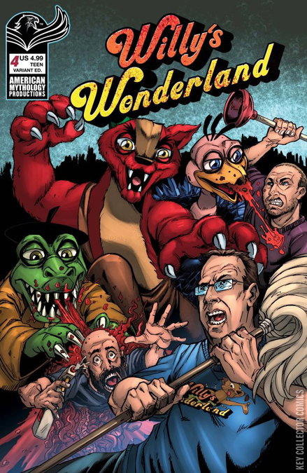 It's all-out war at Willy's Wonderland!! The dramatic conclusion to the series follows Willy and his crew of animatronic terrors after turning the town of Hayesville into their own personal blood bath. The townspeople unite to take the fight back to Willy's, but what starts as a last stand for their humanity turns into an all you can beat gore fest for the ages when Willy, Gus, Sara, Knighty, and the whole gang reminds everyone what happens when you corner a wild beast! The Super Happy Fun Room is open and waiting for you!! Don't miss the surprise ending that'll have Willy fans screaming! Willy's Wonderland Prequel #4 comes with three covers - Main Connecting Cover (issues #1-4 make a huge single shot of terrifying birthday horror) by the horror team of Buz Hasson & Ken Haeser (The Living Corpse), "Creepy" Variant by interior artist Puis Calzada (Hatchet), and a special rare "Slashin' Time" movie poster edition featuring Gus Gorilla!