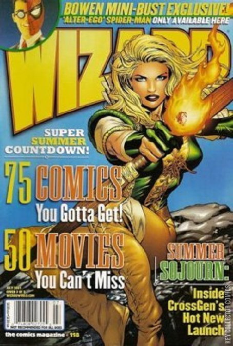Polybagged with extras. Last Team Standing: JLA: Year One vs. the original Avengers drawn by Mark Bagley and Art Thibert; comparing classic Marvel, Marvel Knights and Ultimate Marvel, with Jim Calafiore illo; Wizard previews comic-related movies; Geoff Johns interview; 5 pages from Sojourn Prequel; 2001 summer preview; Basic Training by Pat Lee; Book of the Month: Hellblazer; Secret Stash: Pantheon; comics' sexiest moments; Jim Steranko checklist; The Hot Seat: Angelina Jolie. Cover price $4.99.
