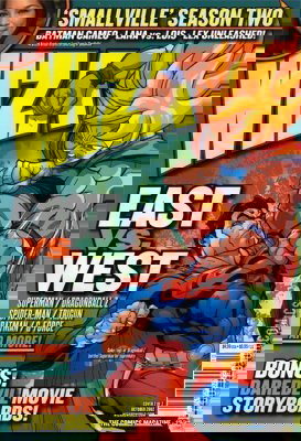 Cover 1 of 2: Captain America cover by John Cassasay; Cover 2 of 2: Superman/Goku cover by J. Scott Campbell , 9/11 remembered "One Year Later" . Polybagged with extras. 11 pages from JLA/JSA: Virtue and Vice; 3 pages from Xin: Legend of the Monkey King; John Cassaday and John Ney Rieber discuss Captain America; East vs. West opening illo by Kaare Andrews, while the following battles are featured: Superman vs. Goku by Long Vo and Udon Studios, Spider-Man vs. Vash the Stampede by J.G. Jones, G-Force vs. the Bat-family by Phil Jimenez and Larry Stucker, Wolverine vs. Manji by Ethan Van Sciver and Tetsuo vs. Phoenix by Pat Lee; Q & A with Miles Millar and Alfred Gough; Joe Kubert interview; Q & A with Guillermo del Toro on the Hellboy film; Basic Training by Collin Grant; Book of the Month: Daredevil; Secret Stash: PvP; mini-checklists for John Cassaday, Bryan Hitch, Geoff Johns, Greg Land, Pat Lee, Frank Quitely and Mike Wieringo; In Remembrance: Joe Quesada looks back upon 9/11. Cover price $4.99.