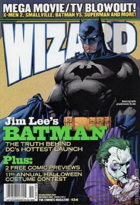 Cover 1 of 3: Wolverine/Jean Grey cover by Frank Cho; Cover 2 of 3:  Cover 2 of 3: Batman Cover by Jim Lee; Cover 3 of 3: Movie photo collage cover. Last Villain Standing: Marvel villains vs. DC villains drawn by Phil Jimenez and Andy Lanning; 5 pages from The Darkness; 6 pages from Chimera #1; article on Batman: Hush, with comments from Jim Lee, Jeph Loeb and Mark Chiarello; Wizard's wish list of tv series and films as comics, with illos of The Sopranos by John Cassaday, The Matrix by Steve Skroce, The Osbournes by Jim Mahfood, Harry Potter by Humberto Ramos, Lord of the Rings by Ale Garza and Britney & Eminem by J. Scott Campbell; Q & A with Bill Jemas, with Jan Duursema illo; Book of the Month: The Ultimates; Secret Stash: One Plus One; The Hot Seat: John Carpenter. Cover price $4.99.