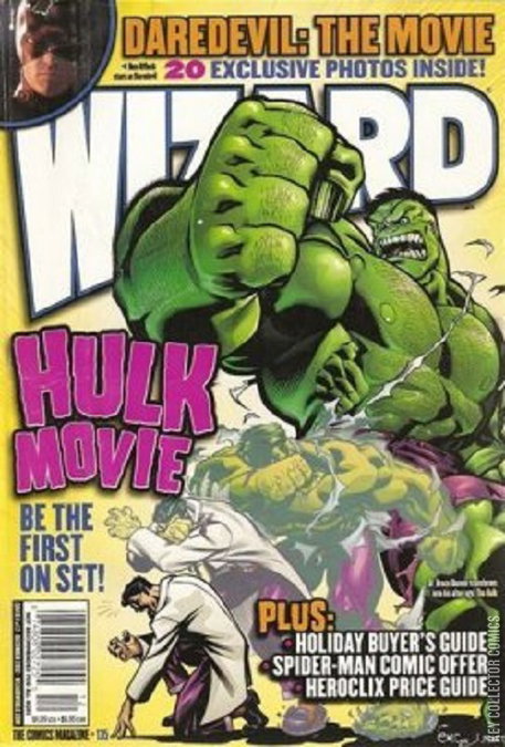 Cover 1 of 2: Hulk by Ed Guinness; Cover 2 of 2: Daredevil and Elektra by Greg Horn. Last Man Standing: Thor vs. Captain Marvel (from DC) drawn by Rags Morales; 7 pages from Ultimate War #1; Q & A with Kevin Smith; 22 photos from the Daredevil film; Wizard's on the set of the Hulk film; 10 reasons why Marvel should 'Ultimize' its entire universe, with illo by Ken Lashley and Draxhall Jump Studios; 4 best buzz books: Y-The Last Man, Exiles, Alias and Queen & Country; article on Bill Finger, with comments from Sheldon Moldoff, Martin Nodell, Denny O'Neil, Jerry Robinson, Julius Schwartz, Michael Uslan and Ed Brubaker; Wizard analyzes the League of Extraordinary Gentlemen series; Alex Ross casts the Battle of the Planets movie; Secret Stash: The Goon; Adam Kubert artwork for Jim McLauchlin's wedding program; The Hot Seat: Bruce Campbell. Cover price $4.99.