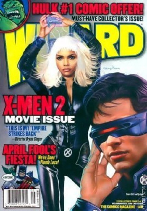 Cover 2 of 3: Halle Berry as Storm with James Marsden as Cyclops digitally rendered by Greg Horn. Polybagged with extras.5 questions with Colleen Doran; Last Man Standing: the Osbournes vs. the Osborns drawn by Jim Mahfood; First Look: Teenage Mutant Ninja Turtles, with comments from Peter David; Wizard looks at comics' most ridiculous moments; 15 reasons why X2: X-Men United will blow away the first X-Men film; X2: X-Men United screenwriters Mike Dougherty and Dan Harris open up 'The Stryker Files' and offer profiles of Wolverine, Charles Xavier, Magneto, Storm, Cyclops, Jean Grey, Nightcrawler, Mystique, Rogue, Iceman, Pyro and Deathstrike; Q & A with Geoff Johns, with Scott Kolins illo; 12 pages from 411 #1; G.I. Joe parody movie poster drawn by Dave Dorman; Q & A with Mark Millar on Superman: Red Son; Secret Stash: Skinwalker; The Hot Seat: Bruce Wayne (from a phone book). Cover price $4.99.