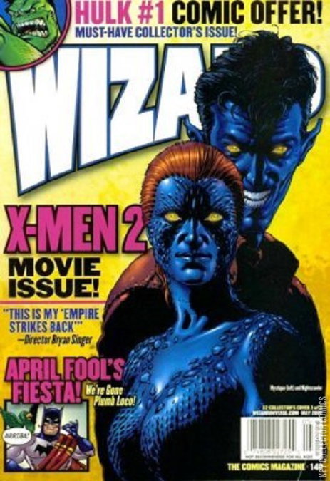 Cover 3 of 3: Nightcrawler with Mystique drawn by New X-Men artist Frank Quitely. Nightcrawler with Mystique drawn by New X-Men artist Frank Quitely. Polybagged with extras. 5 questions with Colleen Doran; Last Man Standing: the Osbournes vs. the Osborns drawn by Jim Mahfood; First Look: Teenage Mutant Ninja Turtles, with comments from Peter David; Wizard looks at comics' most ridiculous moments; 15 reasons why X2: X-Men United will blow away the first X-Men film; X2: X-Men United screenwriters Mike Dougherty and Dan Harris open up 'The Stryker Files' and offer profiles of Wolverine, Charles Xavier, Magneto, Storm, Cyclops, Jean Grey, Nightcrawler, Mystique, Rogue, Iceman, Pyro and Deathstrike; Q & A with Geoff Johns, with Scott Kolins illo; 12 pages from 411 #1; G.I. Joe parody movie poster drawn by Dave Dorman; Q & A with Mark Millar on Superman: Red Son; Secret Stash: Skinwalker; The Hot Seat: Bruce Wayne (from a phone book). Cover price $4.99.