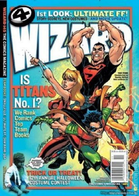 Cover 1 of 3 Teen Titans cover. Not polybagged. 5 questions with John Cassaday; Q & A with Sam Raimi on Spider-Man 2; Wizard crashes the writers' room of Smallville; Marvel's summit meeting to create Ultimate Fantastic Four, with comments from Brian Michael Bendis, Mark Millar, Joe Quesada and Bryan Hitch, and character designs by Hitch; Q & A with Grant Morrison; Wizard ranks the best team books, including Runaways, Planetary, The Ultimates, The Avengers and Teen Titans; Q & A with Brian Azzarello; 7 pages from Sgt. Rock: Between Hell and a Hard Place; Q & A with Brian K. Vaughan; Dan DiDio interview; Fantastic Four illos by Steve Skroce; Q & A with Jonathan Hensleigh on the Punisher film; Q & A with Rob Zombie; Secret Stash: Dark Days; 13 things you didn't know about Vampirella Cover price $4.99.