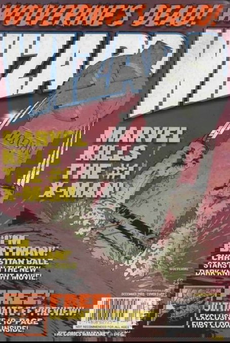Ultimate Spider-Man, Thing, & Wolverine cover by David Finch & Art Thibert. Polybagged with extras. Will Pfeifer discusses Aquaman; Jim Lee discusses 'Coup D'etat'; Q & A with Ron Perlman on Hellboy film; exclusive 8-page New Frontier tale by Darwyn Cooke; Books of the Month: Kurt Busiek discusses Conan, J. Michael Straczynski discusses Supreme Power, Will Pfeifer discusses H-E-R-O and Nunzio DeFilippis and Christina Weir discuss New Mutants; Q & A with Paul Jenkins; Alex Ross answers fans' questions; 9 pages from Ultimate Fantastic Four; Kirsten Dunst discusses Spider-Man 2; Avi Arad, Miles Millar, Alfred Gough, Tom DeSanto and David Goyer discuss comics on screen, with Greg Horn illo; Basic Training by Joe Kubert (Part 4 of 6); Q & A with Michael Turner; Secret Stash: Barefoot Serpent; 14 things you didn't know about Alan Moore Cover price $4.99.
