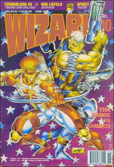 Rob Liefeld cover. Polybagged with Youngblood trading card. Has pull out centerfold poster. Rob Liefeld interview; Hank Kanalz discusses Youngblood and Brigade; the origins of Youngblood; article on the past, present and future of Cable; Mark Bagley discusses The New Warriors and Amazing Spider-Man; Golden-Age correspondent Jack Curtin writes about the Justice Society; development history of the Spider-Man movie; Brutes & Babes by Bart Sears. Cover price $2.95.