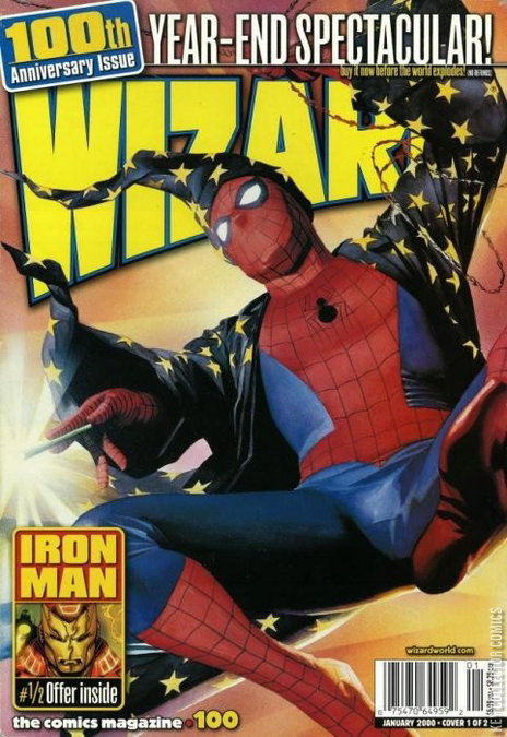 Spider-Man painted cover by Alex Ross. Polybagged with extras. Last Man Standing: Darth Vader vs. Darth Maul drawn by Jae Lee; First Look: Gatecrasher, with comments from Mark Waid; First Look: Aria/Angela, with comments from Brian Holguin; Wizard compares America's Best Comics, Cliffhanger and Marvel Knights imprints; Wizard settles comics' greatest debates; the best of 1999; Q& A with Image's 'founding fathers': Todd McFarlane, Jim Lee, Rob Liefeld, Marc Silvestri, Erik Larsen, Whilce Portacio and Jim Valentino; Wizard looks back on 70 years of comics history; Jimmy Palmiotti, Kevin Smith and Joe Quesada cast the Daredevil movie; Basic Training: Liquid! Graphics on coloring; Top 10 overused comic book plotlines; Character Profile: Superman; Off the Cuff with Adam Kubert; unseen covers gallery: Wizard covers that never ran, including those by Erik Larsen, John Byrne, Bart Sears, Tod Smith, Val Semeiks, Joe Jusko, Mark Texeira, Dan Fraga, Ron Lim, Darick Robertson, Tom Grummett, Mike Wieringo, Alan Davis and Travis Charest. Cover price $5.99.