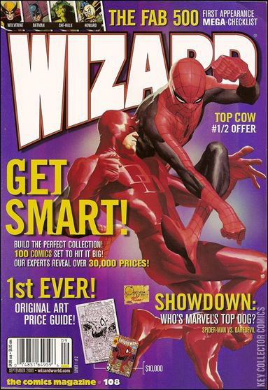 Daredevil vs Spider-Man cover by Joe Quesada & Alex Ross. Polybagged with extras. Last Man Standing: Dr. Fate vs. Dr. Strange drawn by Phil Jimenez; First Look: The First, with comments from Barbara Kesel and Bart Sears; Wizard picks Daredevil over Spider-Man as Marvel's #1 solo hero; Alex Ross and Jim Krueger discuss Universe X; Q & A with Joss Whedon; David Goyer and Geoff Johns cast the JSA movie; Q & A with Greg Rucka on the status of the Whiteout film; Basic Training: Chris Friesen writes about comics restoration; Character Profile: Poet (Rising Stars); Book of the Month: The Authority; 1st Appearance checklist; The Hot Seat: Paul Dini Cover price $4.99.