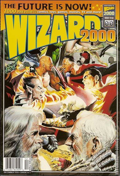 Cover 3 of 3 Kingdom Come vs. Earth X by Alex Ross. BLADE #1/2 comic book offer from Marvel Comics. Remember the hottest comic book movie of last year starring Wesley Snipes? That killer action and adventure returns in this special Wizard #1/2 comic book written and drawn by Bart Sears (Spider-Woman)! This #1/2 comic will feature the first appearance of a terrifying new villain that will be appearing in the ongoing title. Blade will be one of the breakthrough heroes of the 21st century and you can only get his #1/2 comic here in Wizard 2000! The countdown is over! Shipping in November, our next issue Wizard 2000 proudly takes an unprecedented look at the future of comics in the next millennium. Our two covers feature the hottest heroes from the future. Kingdom Come Superman, Batman Beyond, "Days of Future Past" Wolverine, "Future Imperfect" Hulk, Spider-Girl and Earth X Captain America meet on our first cover by Kevin Maguire. Our alternate cover by Adam Warren features a Manga-influenced presentation of Spawn, Tomb Raider Lara Croft, Batman, Spidey, Superman and Wolverine. Who is the next Todd McFarlane? The next Kurt Busiek?, The next Bob Harras? The next Jeff Smith? Find out as we unveil who the superstar creators of the future will be! Take a look a the coolest comics that should, but will never be made including a Kingdom Come/Earth X crossover by Alex Ross, Watchmen II or The Last Galactus Story. The future continues to unfold as Wizard picks the next white-hot book to kick off the new millennium and shows you how to create the ultimate marketable superhero. Jump way forward with Last Words?behold the possible conclusions for heroes like Batman and the Avengers as we talk to today's creators about how these great series could end! Attention new artists, get the real deal on how to make an impressive original portfolio to make you stand out from the crowds of artists trying to get work at comic publishers. Your artist future will suffer if you miss this feature! Wizard 2000 will of course feature of your favorite comic book price guides, columns and departments that you expect from us each month, along with up-to-the-minute news on everything comics-related! CONTESTS: *Win the chance to be a "Wizard-Editor-for-a-Day!" Thats right, We will select one worthy fan to join the fabled Wizard crew at our Bullpen! Edit features, shape the magazine, sit in on key meetings, get your own business cards and more! Cover price $4.99.