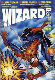 Spider-Man cover. Polybagged with trading card(s). Gatefold cover. Has pull out poster. Article on the Spider-man titles, with comments from Danny Fingeroth, Mark Bagley, Steven Grant and David Michelinie; article on the state of the DC Universe before, during and after Crisis on Infinite Earths; interview with Sergio Aragones and Mark Evanier; Brutes & Babes by Bart Sears; Q & A with John Ostrander on The Spectre; pros discuss what makes a comic book scary; Larry Stroman and Todd Johnson discuss Tribe; 2 pages from Q-Unit #0; Wizard Profile: Bob Layton. Cover price $3.95.