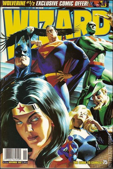 JLA Alex Ross painted cover. Polybagged with trading cards. Dan Jurgens writes about attending a convention in Mexico City; 3-page Sam & Max strip by Steve Purcell; Wizard pits the JLA against its Silver Age counterpart; Joe Kelly interview; Q & A with Jim Lee; Basic Training by Mike Mignola; Character Profile: Deadpool; Top 10 Characters Who Are Still Dead; Creator Spotlight: Brandon Peterson; Wizard Profile: Steven Hughes. Cover price $4.55.