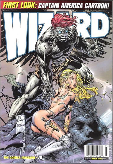 X-men cover. Polybagged with trading cards. First Look: Fathom, with comments from Michael Turner; Troy Hickman discusses Holey Crullers; John Arcudi and Gary Frank discuss Gen13; article on Awesome Entertainment, with comments from Steve Skroce, Rob Liefeld, Jef Matsuda, Ian Churchill, Jeph Loeb and others; Wizard drafts the ultimate super-hero team, with Phil Jimenez illo; a look at 8 creators to watch out for: David Finch, Batt, Leinil Francis Yu, Leonardo Manco, Ed McGuinness; Salvador Larroca, John Cassaday and Jose Ladronn; Q & A with Joe Kelly and Steven T. Seagle; Basic Training by Brent Anderson; report on Captain America animated series; Character Profile: Green Arrow; Creator Spotlight: Andy Kubert; Time Travel: a look back at Saga of the Swamp Thing in 1984. Cover price $4.55.