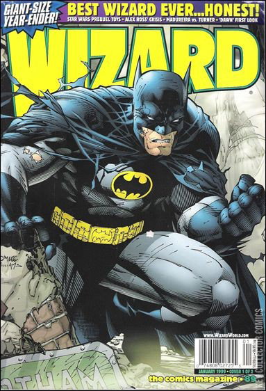 Superman vs Spider-Man cover painted by Alex Ross. Giant Size Year Ender. Polybagged with extras. Ian Churchill writes about visiting the U.S.; Last Man Standing: Batman vs. Wolverine drawn by Mike Wieringo; First Look: Dawn II: The Return of the Goddess, with comments from Joseph Michael Linsner; article on Batman's 'No Man's Land' storyline, with comments from Dennis O'Neil, Greg Rucka, Bob Gale and Paul Dini; Q & A with Avi Arad; a day spent with Stan Lee; Alex Ross discusses painting the dust jacket cover for the Crisis on Infinite Earths hardcover; Q & A with Joe Madureira and Michael Turner; Wizard answers the most important questions for 1999, with Sergio Aragones illos; best of 1998; Basic Training by Scott McCloud; Top 10 Monkeys; Character Profile: Spawn; Off the Cuff with J. Scott Campbell; Time Travel: Tom Root looks at Cerebus. Cover price $4.99.