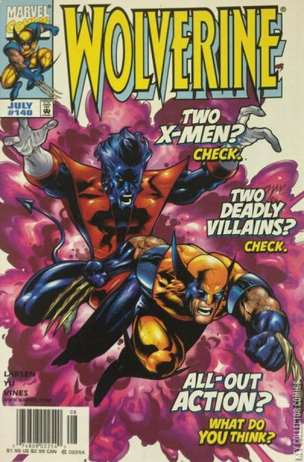 Home / Marvel / Wolverine / Wolverine #140 Marvel Released July 1999 Wolverine #140 Add to Collection Want It Synopsis Guest Starring Nightcrawler. Add to Collection Buy it on eBay Buy on eBay Low $1 Mid $2 High $3 Synopsis Guest Starring Nightcrawler. Details Series Wolverine Cover Date July 1999 Pages 32 UPC 07480802254008 Cover Price $1.99 Final Order Cutoff N/A Creators No creators listed. Price Guide Log in or subscribe to access detailed graded price information and market insights. Log In Subscribe